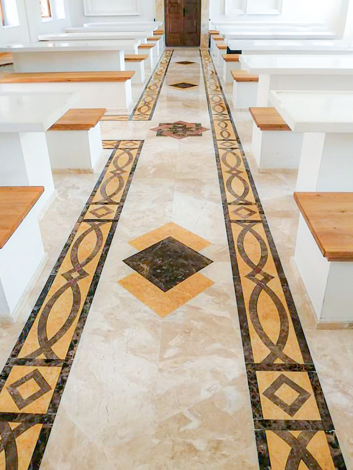 Изработка на подови (интарзии) со разни форми и модели на керамика и мермер по даден цртеж.
